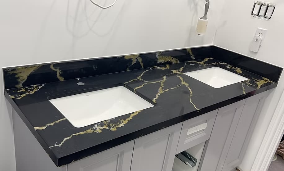 a black quartz with thick gold veins, creating a mesmerizing effect that is perfect for any design.?The gold veins create a luxurious look that will elevate any space